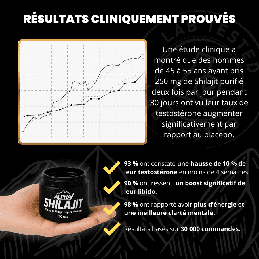 Une étude clinique randomisée a montré que 250 mg/j de Shilajit purifié pendant 90 jours augmente significativement la testostérone totale et libre chez l’homme.